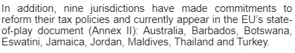 此外,9個司法管轄區(qū)已作出改革其稅收政策的承諾,已從非合作名單除名,但仍處于考察階段,包括澳大利亞、巴巴多斯、博茨瓦納、斯瓦蒂尼、牙買加、約旦、馬爾代夫、泰國和土耳其。