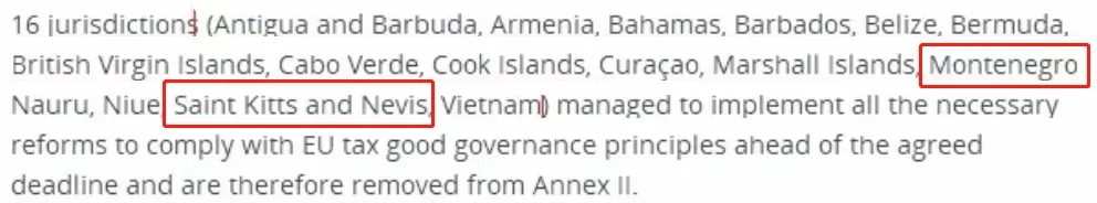 早在2020年2月更新的非合作名單中,就移除了黑山、圣基茨和尼維斯等16個管轄區(qū),這也意味著,目前黑山、圣盧西亞、圣基茨均在歐盟稅收白名單之中。