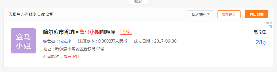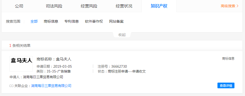 我們通過(guò)天眼查發(fā)現(xiàn),“盒馬夫人”、“盒馬爸爸”都是湖南每日三果貿(mào)易有限公司注冊(cè),“盒馬兄弟”商標(biāo)持有人是香港品牌集眾管理有限公司,“盒馬小姐”持有者是哈爾濱市香坊區(qū)盒馬小姐咖喱屋,目前該公司顯示已注銷。