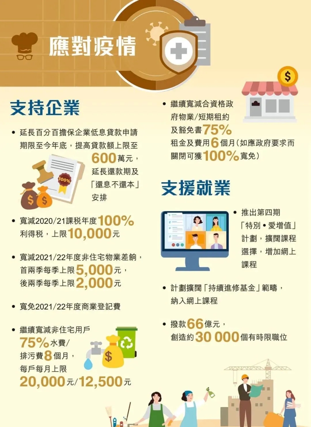 — 繼續(xù)寬減合資格政府物業(yè)/短期租約及豁免書75%租金及費(fèi)用6個(gè)月(如應(yīng)政府要求而關(guān)閉可獲100%寬免);