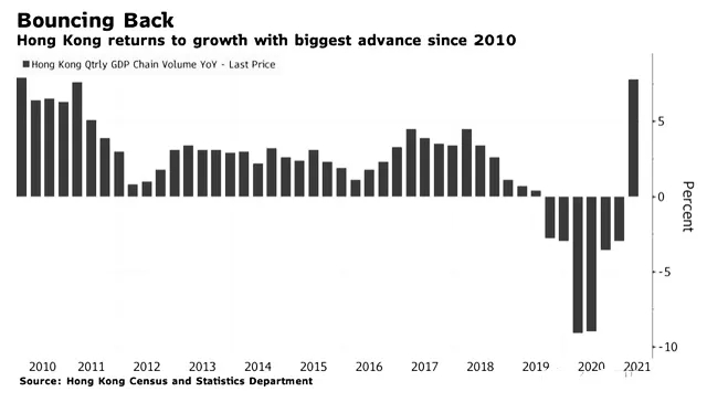 前幾日,香港政府公布,第一季經(jīng)濟(jì)按年實(shí)質(zhì)增長(zhǎng)7.9%,較初值高0.1個(gè)百分點(diǎn),結(jié)束連續(xù)六個(gè)季度收縮的情況。