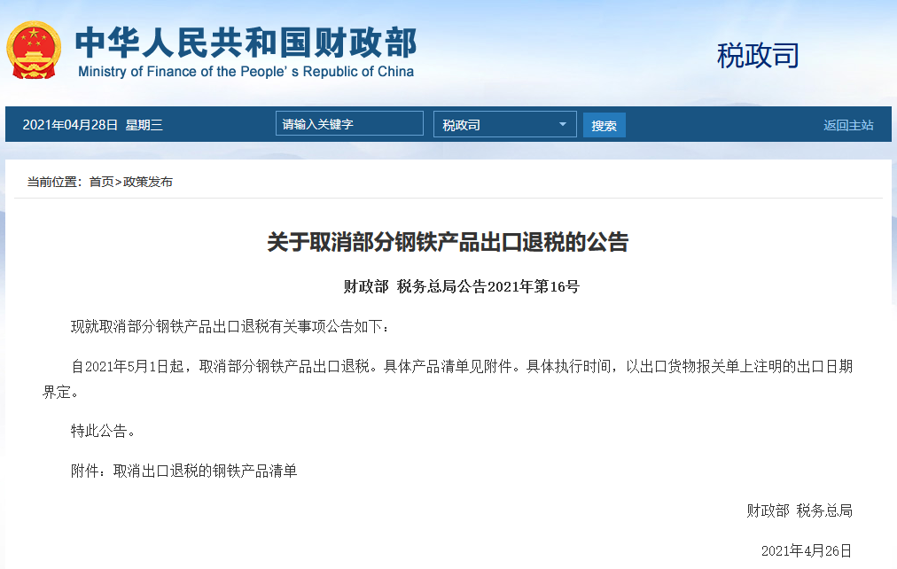自2021年5月1日起,取消部分鋼鐵產(chǎn)品出口退稅。具體產(chǎn)品清單見附件。具體執(zhí)行時間,以出口貨物報關(guān)單上注明的出口日期界定。