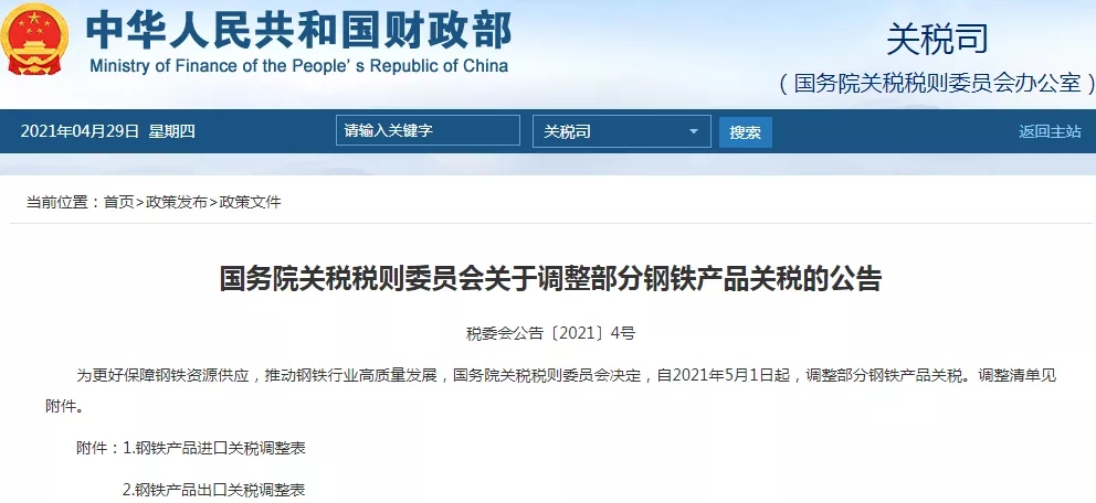 2021年5月1日起我國調(diào)整部分鋼鐵產(chǎn)品關(guān)稅及出口退稅率