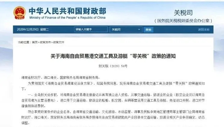 12月29日,財政部、海關總署、稅務總局公布了《關于海南自由貿(mào)易港交通工具及游艇“零關稅”政策的通知》(下稱《通知》),在海南全島封關運作前,對海南自由貿(mào)易港注冊登記并具有獨立法人資格,從事交通運輸、旅游業(yè)的企業(yè),進口用于交通運輸、旅游業(yè)的船舶、航空器、車輛等營運用交通工具及游艇,免征進口關稅、進口環(huán)節(jié)增值稅和消費稅。