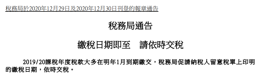 近期香港稅務(wù)局官網(wǎng)刊登了一則通告【繳稅期即至 請依時交稅】,2019/20課稅年度稅款在1月份即將到期繳納,提醒各納稅人留意稅單上的繳納日期,按時交稅。