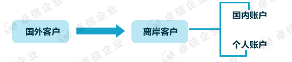 離岸賬號收到國外客戶貨款后,可將成本打給國內(nèi)進出口公司核銷退稅,利潤可轉個體工商戶結匯。如圖: