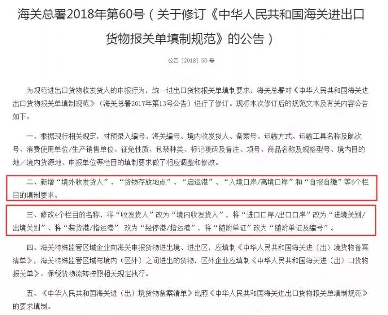 我們可以看到,在第60號(hào)公告中,最引人關(guān)注的是第二條新增“境外收發(fā)貨人”、“貨物存放地點(diǎn)”、“啟運(yùn)港”、“入境口岸/離境口岸”和“自報(bào)自繳”等5個(gè)欄目的填制要求。